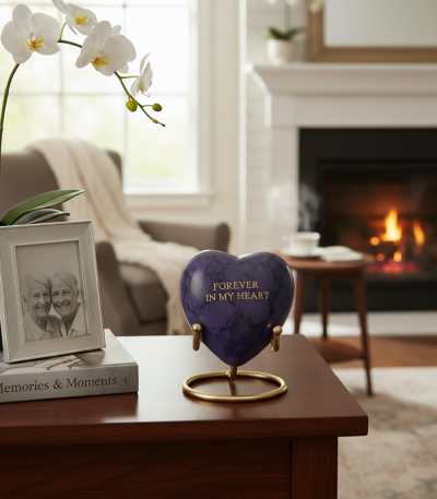 HN6034-Heart-Shaped Metal Cremation Urn with Purple Fire with Quote