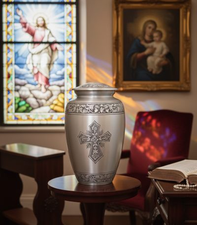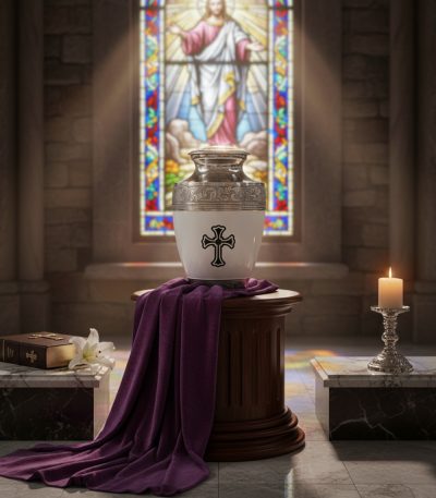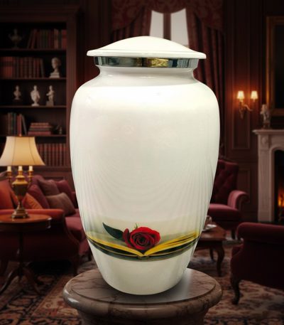 HN6033-Heart-Shaped Metal Cremation Urn with Off White Enamel with Silver Heart