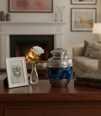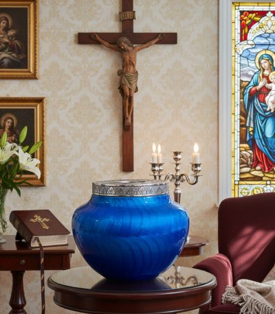 NU1000-Cremation Urn Silver Embossing with Blue Fire Design