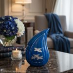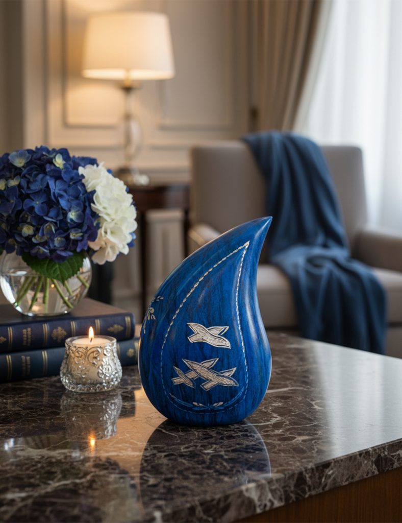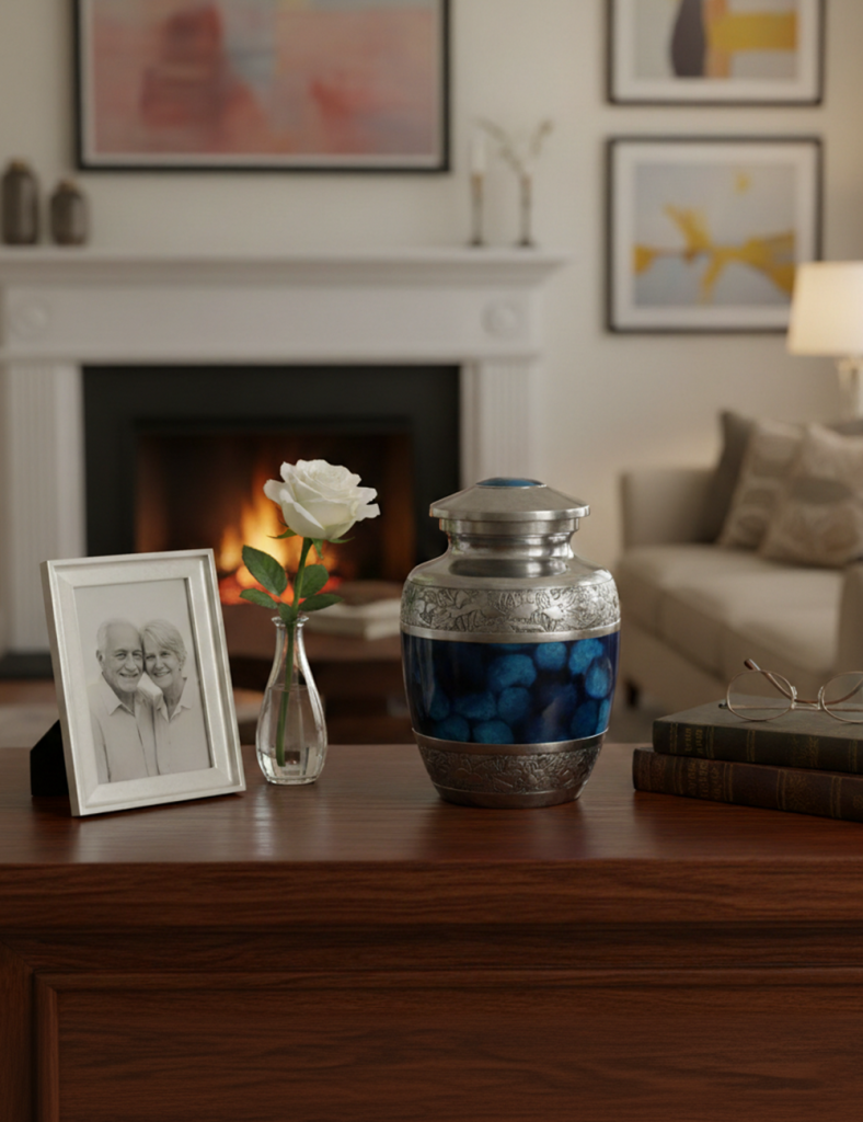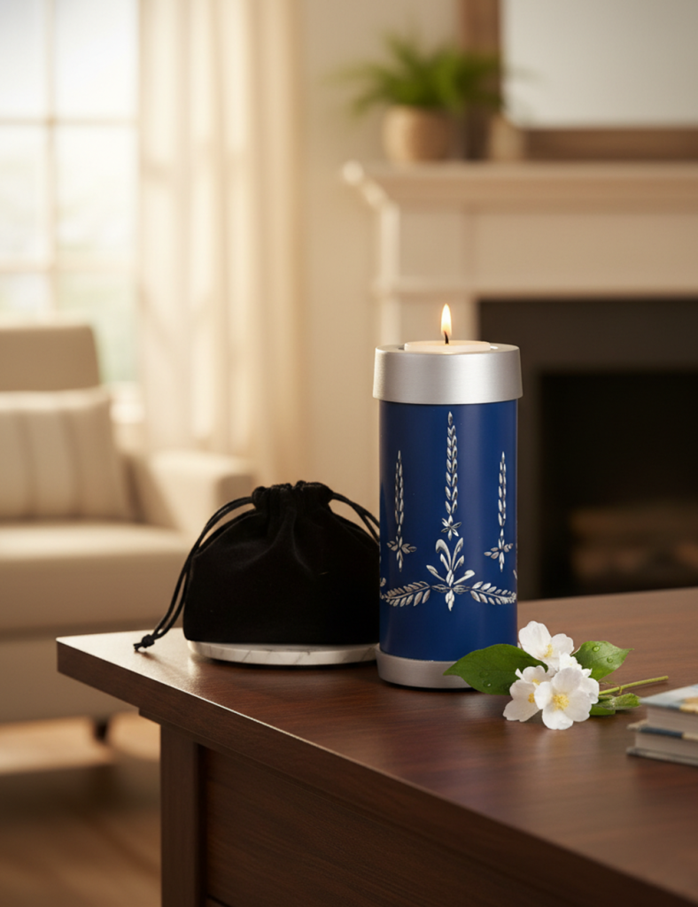 NU1000-Cremation Urn Silver Embossing with Blue Fire Design