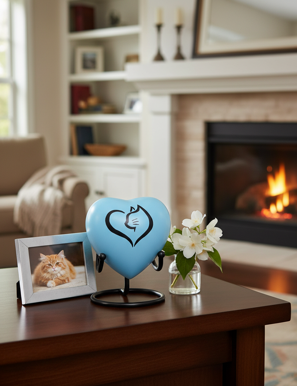 Home Cremation Urns Collection HN6029-Heart-Shaped Metal Cremation Urn with Sky Blue Cat