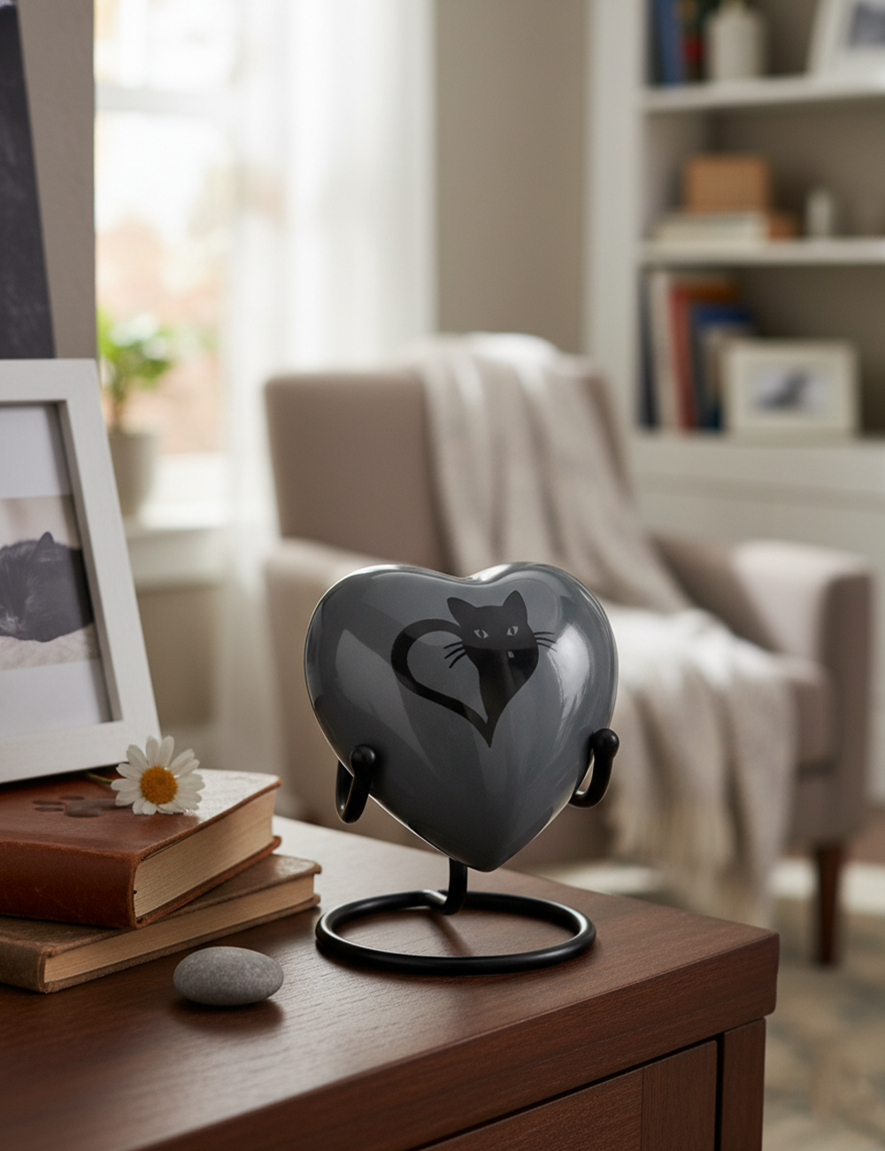 HN6030-Heart-Shaped Metal Cremation Urn with Gray Black Cat