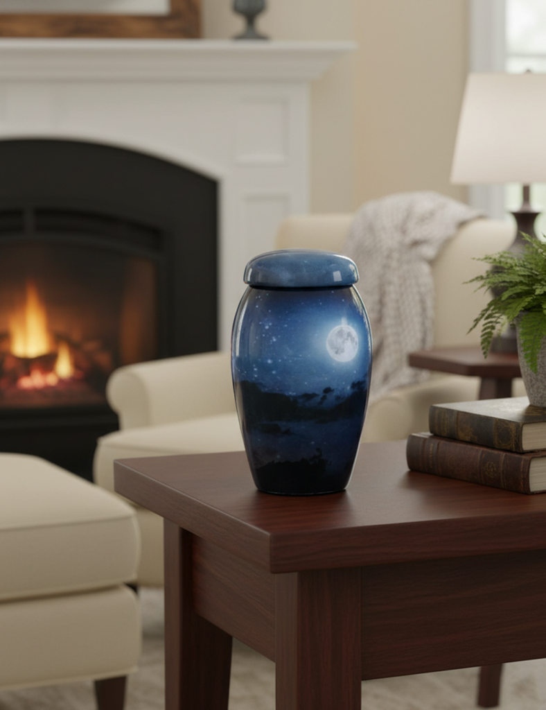 NU1000-Cremation Urn Silver Embossing with Blue Fire Design
